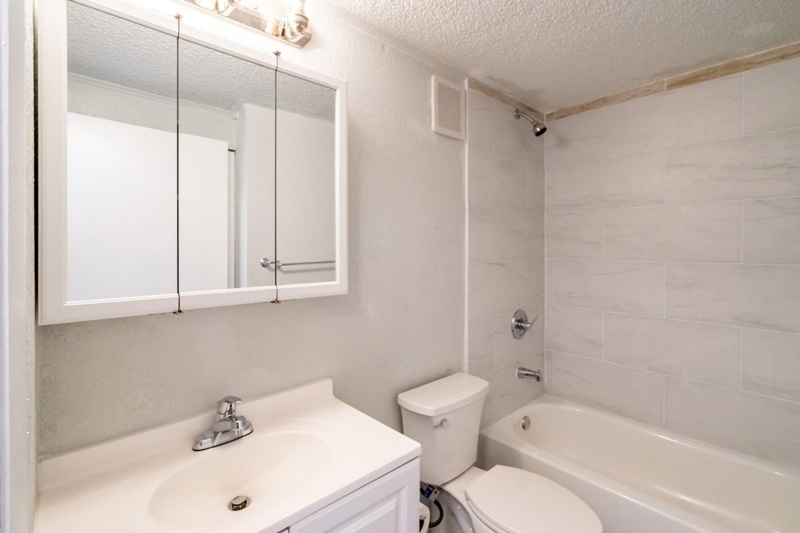 The bathroom has just been renovated with all new ceramic tiles, new tub, and toilet.