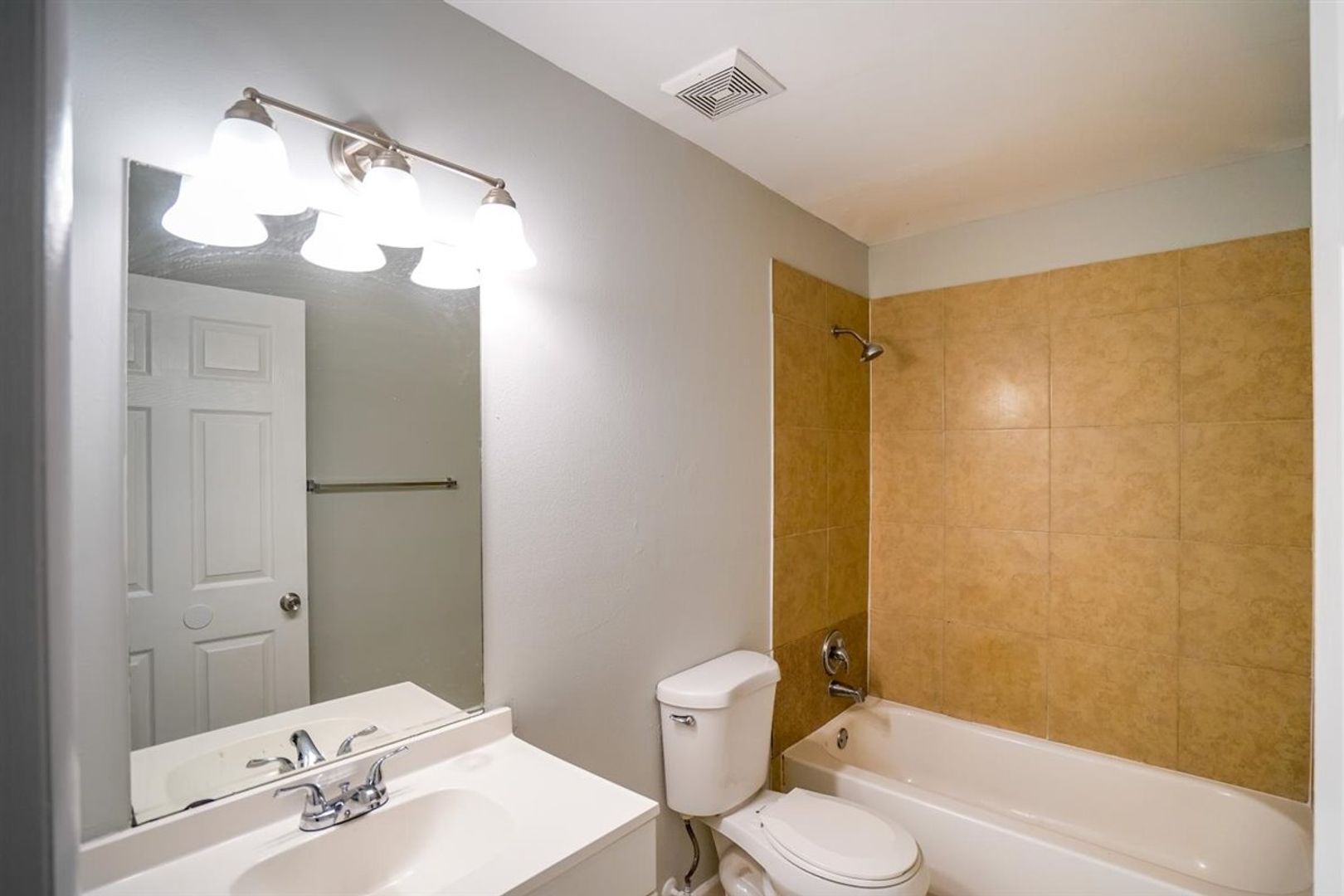 The bathroom has just been renovated with all new ceramic tiles, new tub, and toilet.